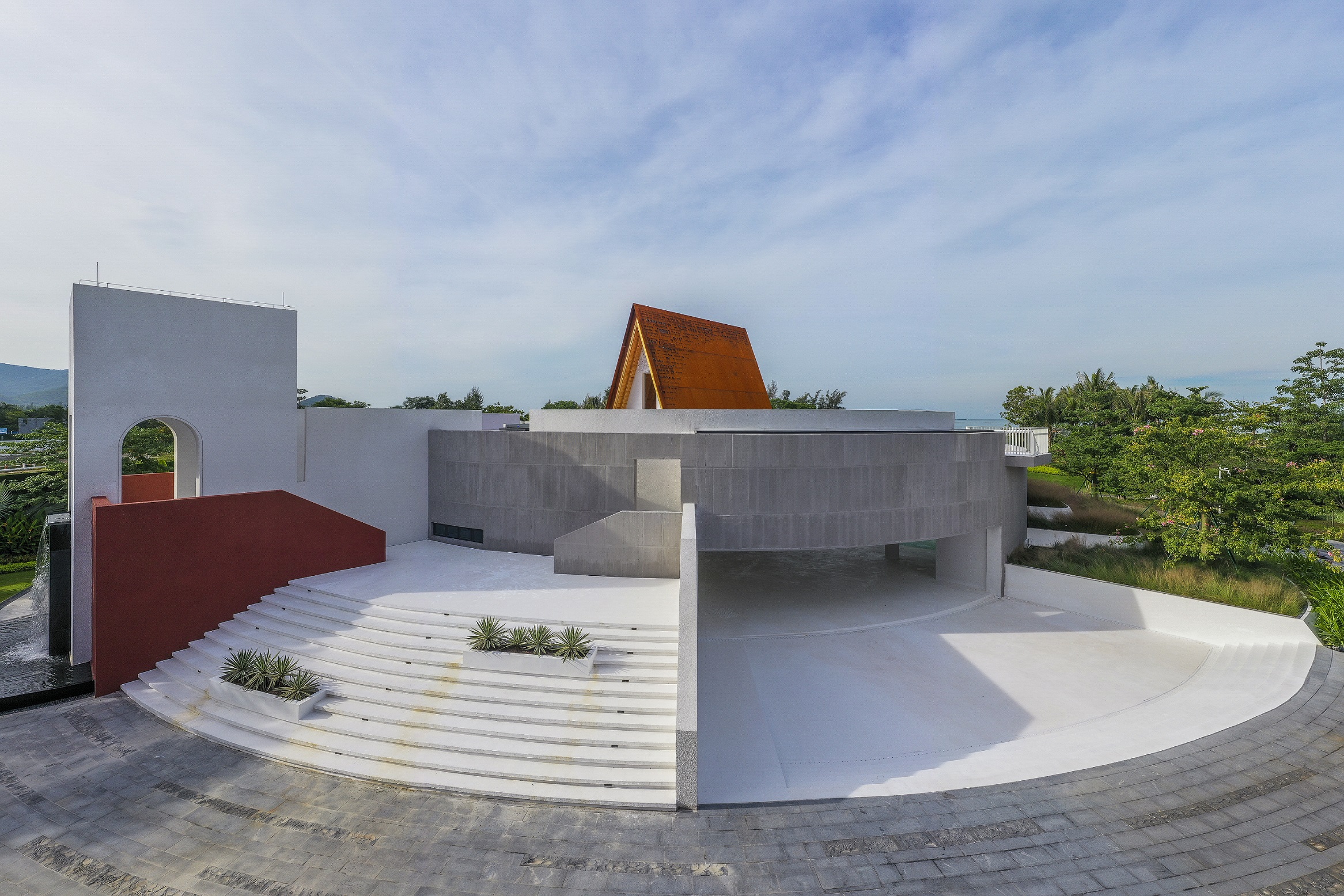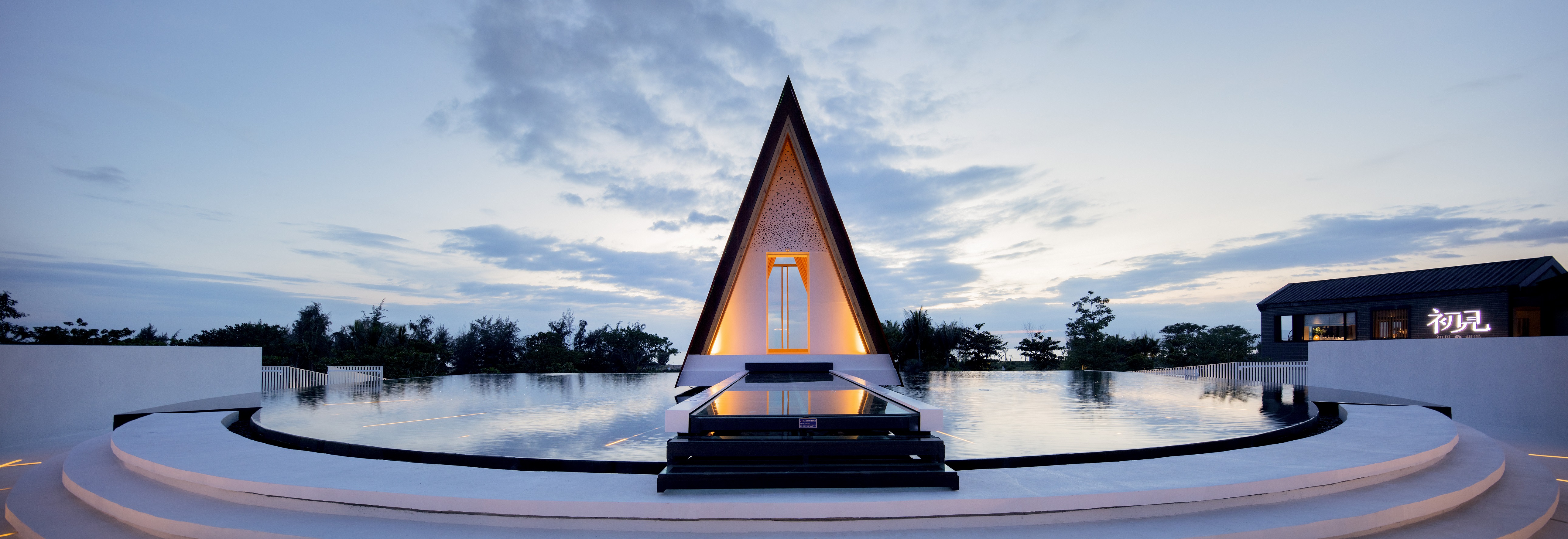 设计师捕捉自然中最重要的元素:大海、天空、夕阳,加入三角形和圆形两个强有力的几何元素。简洁有力的三角形,犹如矗立海天之间永恒的纪念碑,刺向天空的形态带着强烈的精神性。穿过中间缝隙的夕阳之光,物化了对光阴、时间的思考、感悟。而旋转的装置,可追随四季落日的位置,生动地诠释了此时、此刻、此生,“刹那即永恒”的含意。