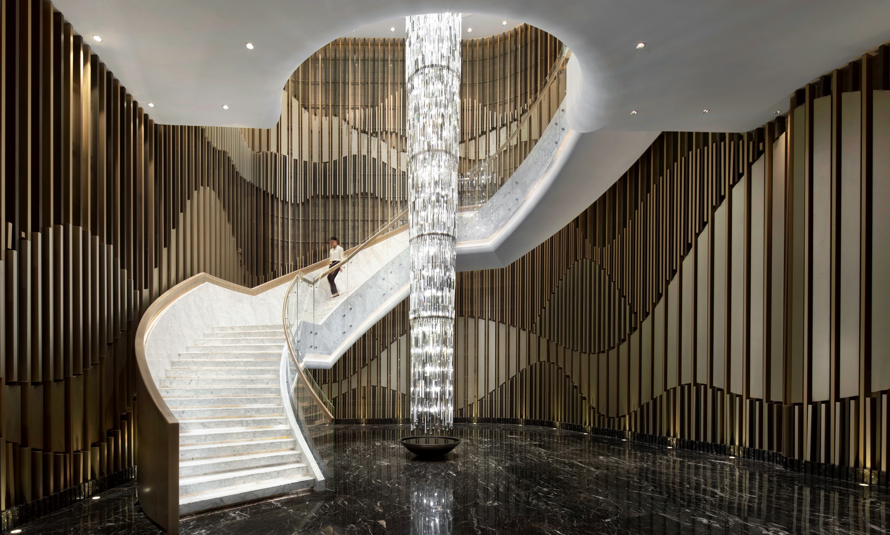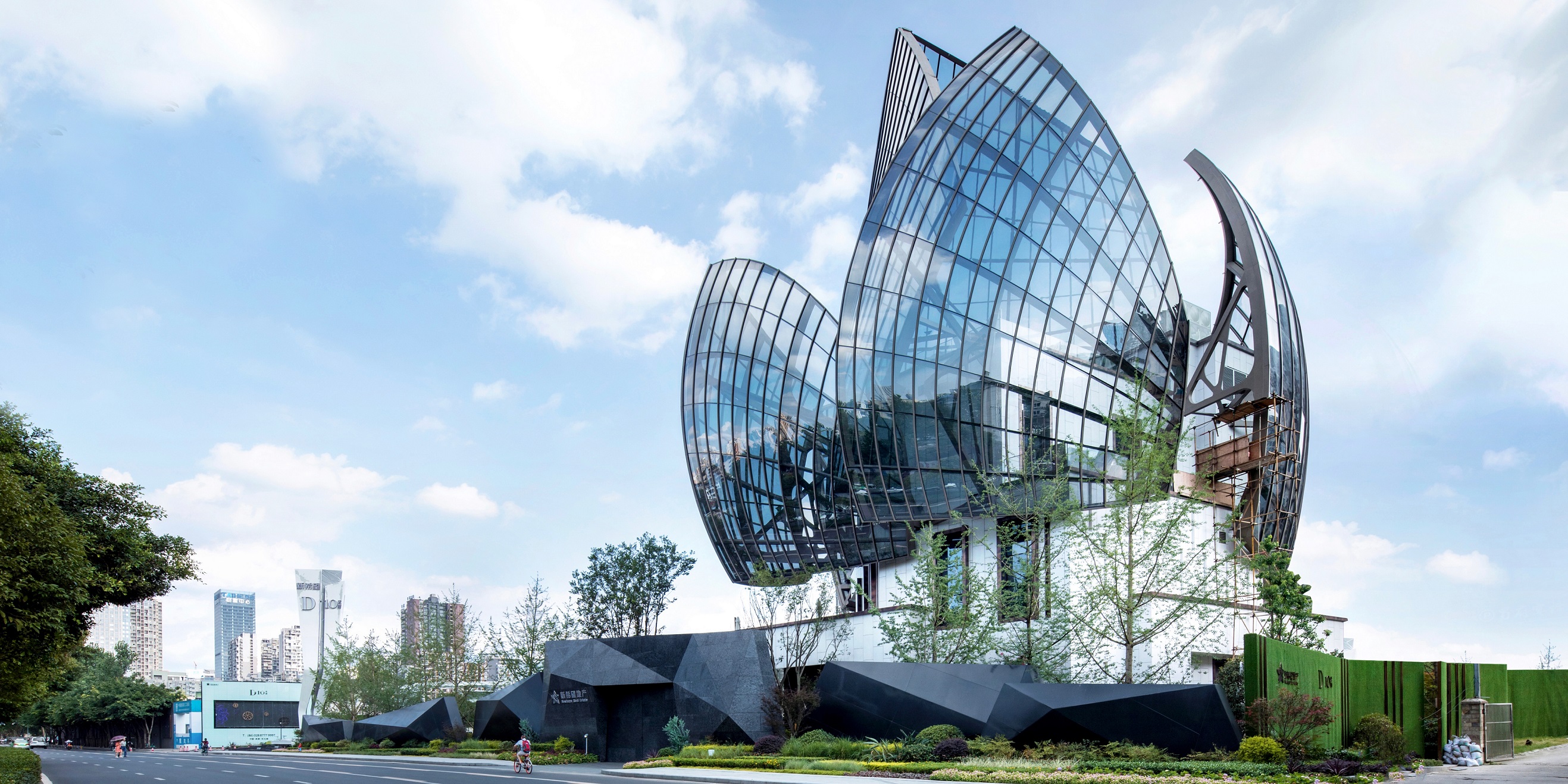 “天府之冠”的设计概念,最终完美的解决了所有诉求。“冠”取冠军、桂冠之意,冠绝天府的概念很好的体现出了“中国最高的住宅项目”,以及超高端的项目定位。建筑造型上充分体现了“虚实对照”、“曲直对比”的设计手法,如绽放花瓣的三维曲面玻璃幕墙,盛开于银白色陶板与古铜色铜板幕墙编织的基座之上。景观示范区“水晶梯田”的设计概念取自于驰名中外的四川黄龙梯田,整个景观示范区延续到入口的精神堡垒,动感十足,线条曲中带直,一气呵成。