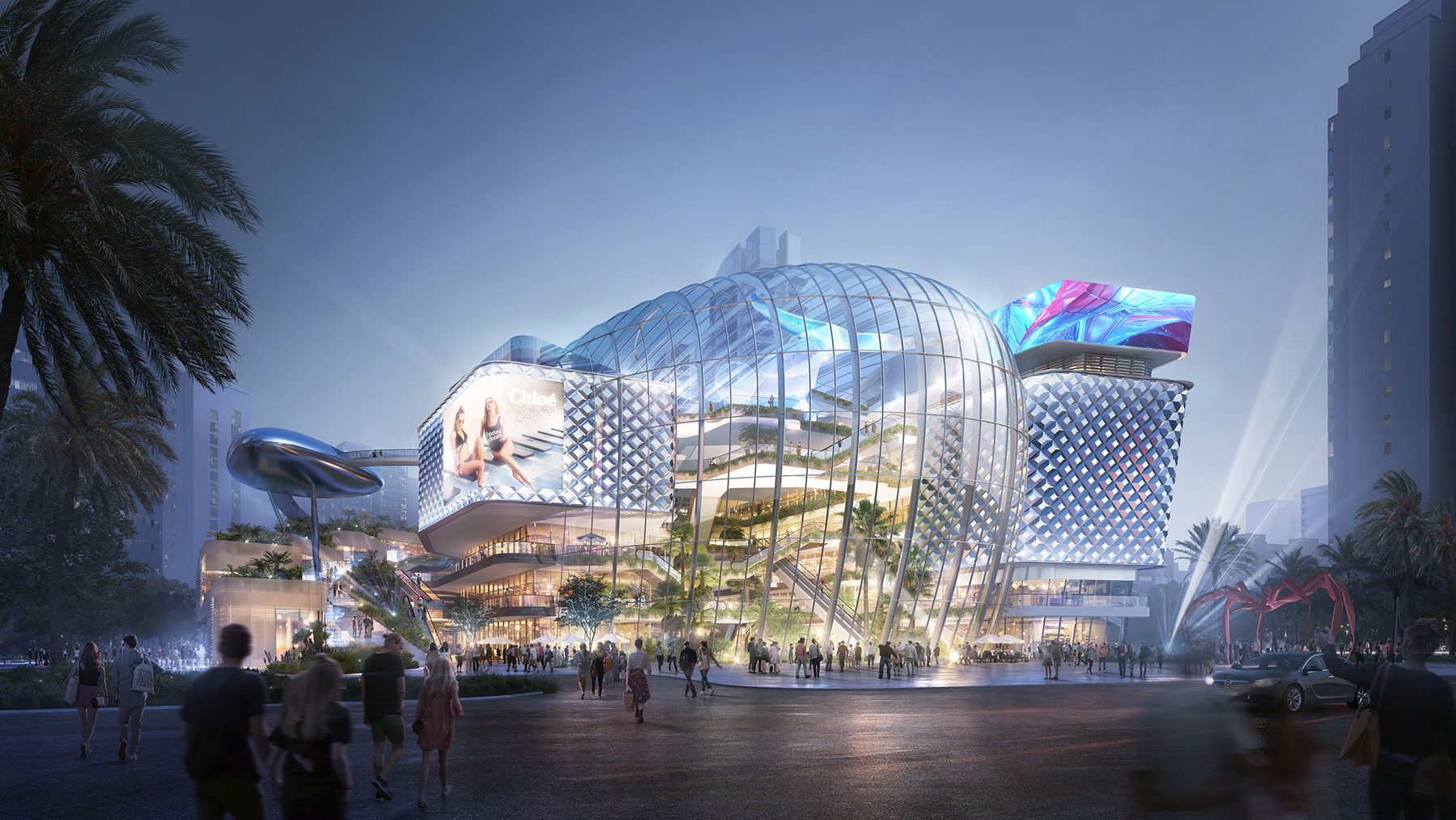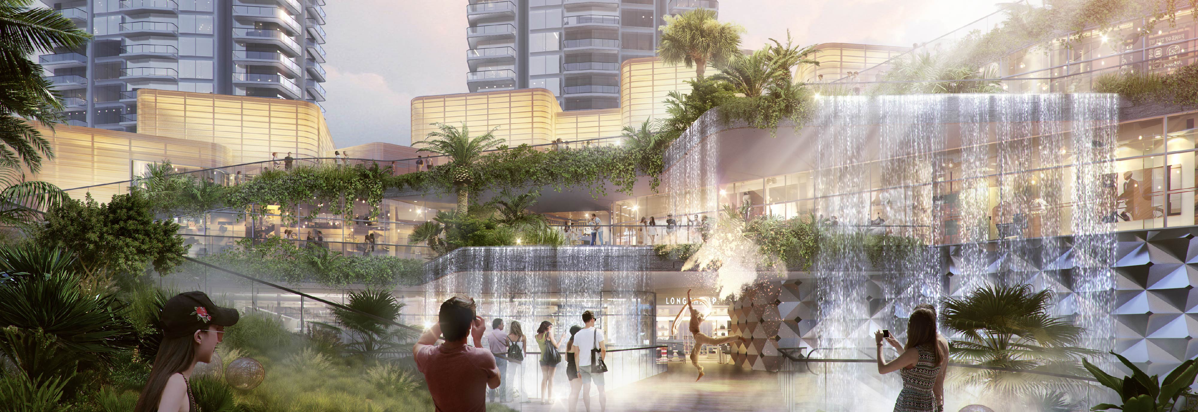 基地周边现状条件复杂,团队针对项目的不利条件与区位气候条件,方案针对空间布局、商业动线、体验主题等,都做了有原创性的设计创新。商业部分加大生态中庭入口形式,将景观与商业结合更密切,城市公共空间的延伸创造独特的商业形象与购物体验,使其沉浸感更为强烈。