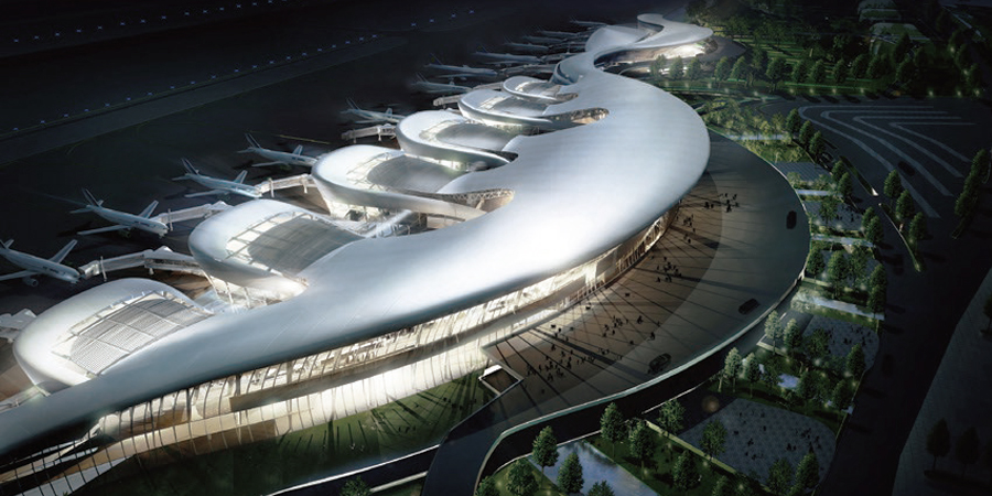 有机动感的形态学主题,优美的自然与生物形态大都呈现出一种曲线的有机的形态。航站楼有机的形态似从大地中生长出来,曲线流动的屋顶是对自然形态的模仿,也是对周围环境最好的呼应。优美飘逸之感提升整个建筑的形象张力,表现一种建筑与环境、人与自然的和谐。