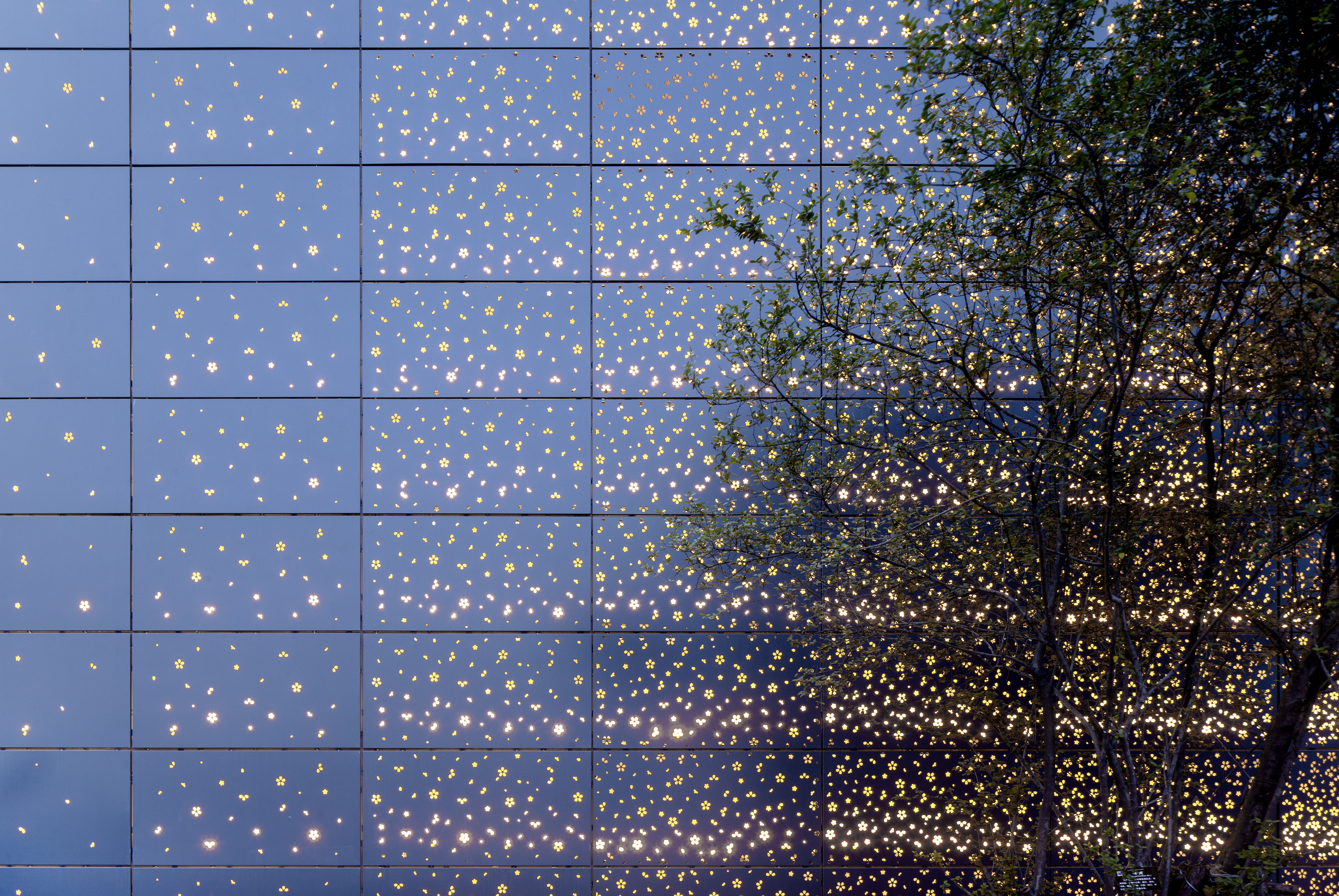田园生活馆的空间构成源于传统建筑的空间原型——庭园空间,而围合庭园的建筑南北通透、东西实墙。田园生活馆的东西侧外墙设计提取了地域的象征元素——桃花,通过桃花图案的镂空铝板的运用,使建筑表情丰富且具有双重性:白天稳重不失细腻,夜晚则显得浪漫梦幻。建筑在对话传统和地域文化的同时,又展现了现代风采。