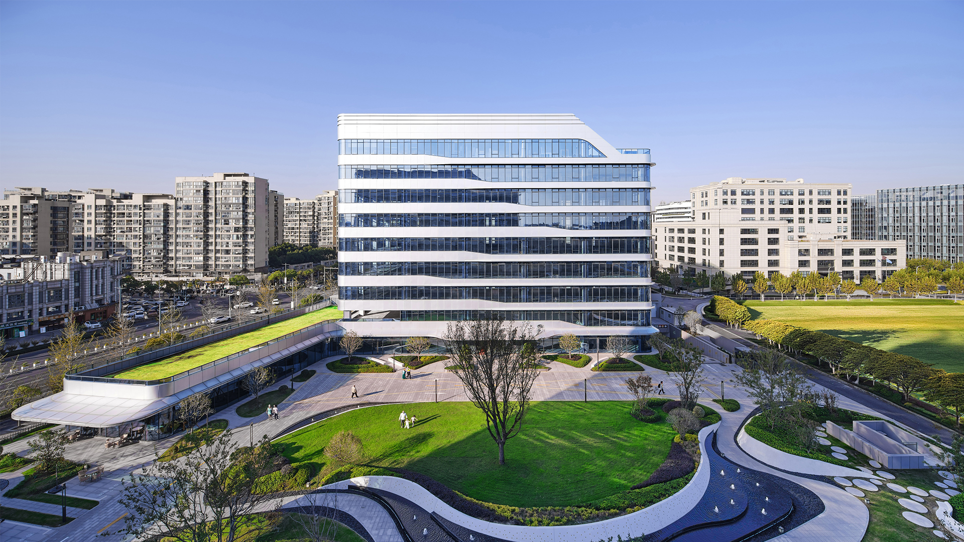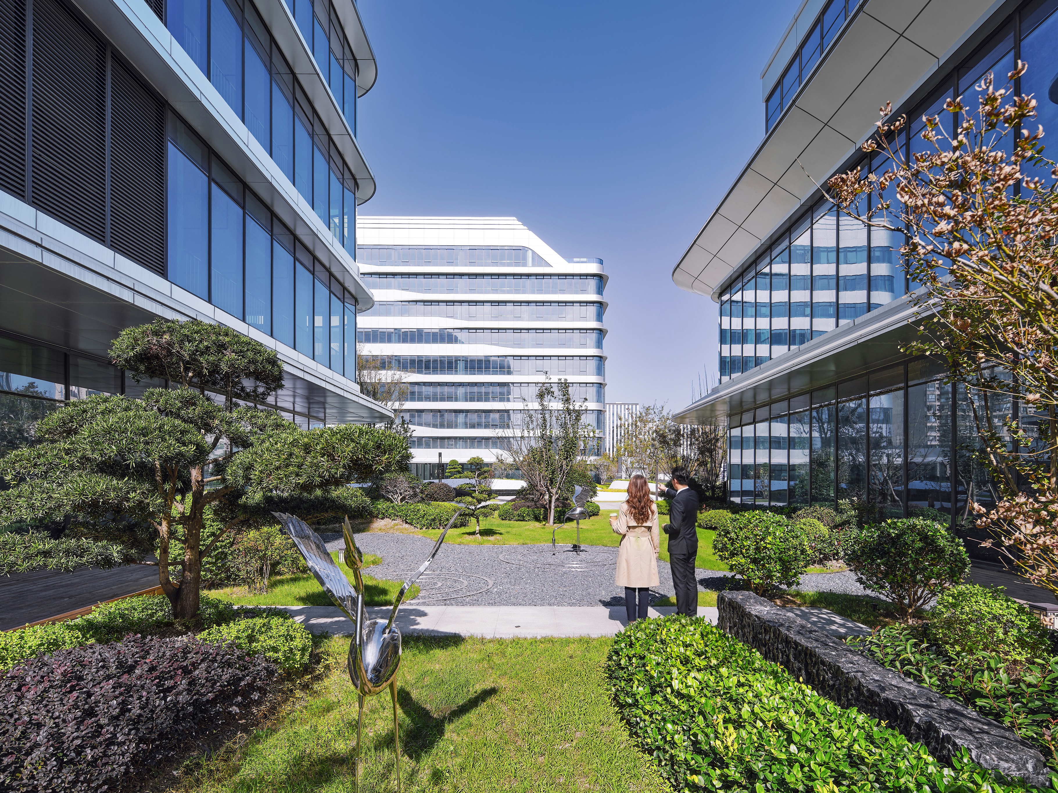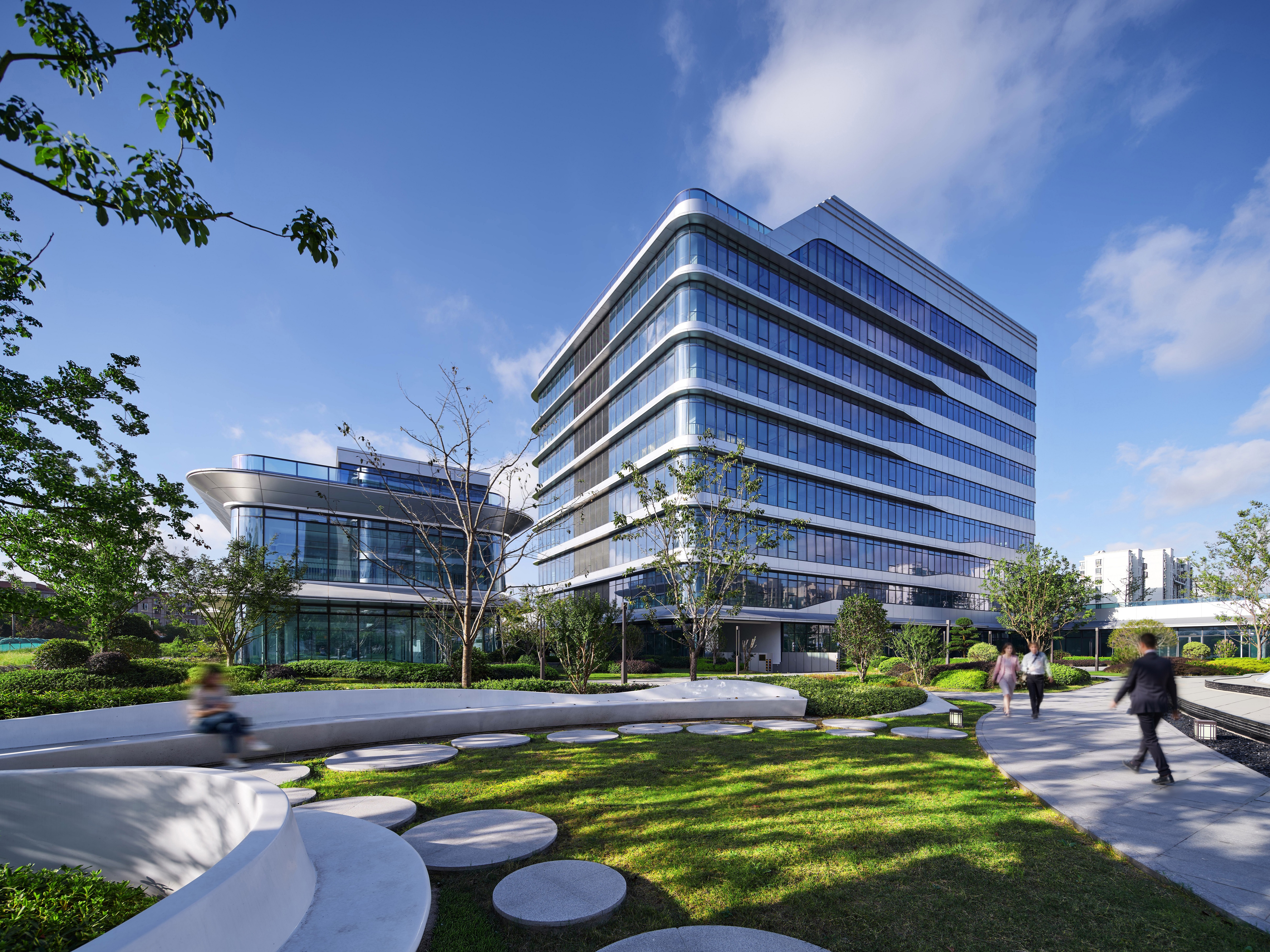项目坐落于上海北虹桥商务区核心,由两栋高层办公楼与一栋独立企业总部楼构成。建筑沿街布局,围合出开阔的中央花园,形成静谧共享的绿色景观,为入驻者提供舒缓休憩的空间。平面规划强调灵活与高效,可适应多元办公需求。建筑造型清新明快,立面通过流畅的横向线条与通透材质相结合,交织出现代质感,彰显出科技与自然相融合的园区气质。花园办公,推窗见绿,在虹桥枢纽旁,实现高效通勤与生态办公的无缝切换。