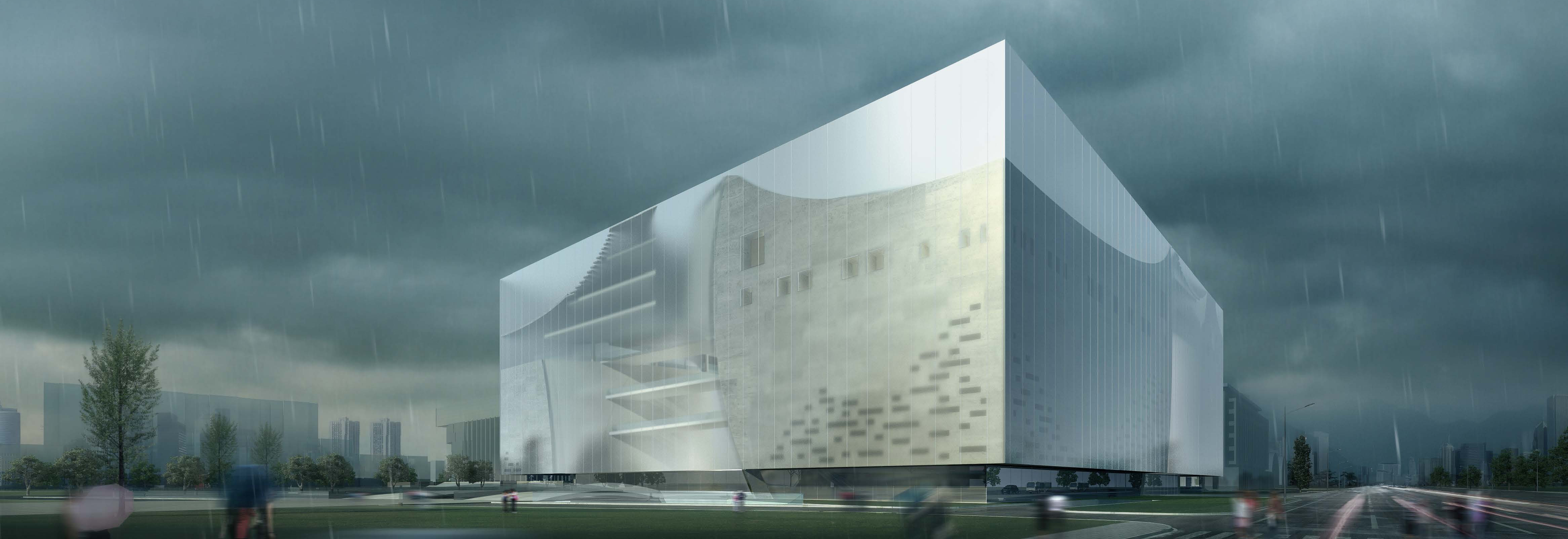 在建筑的屋顶部位,用同样的手法对形体进行切割,球形曲面在建筑立面形成的轮廓,如同环绕这座历史古城的群山丘陵,又使人联想起北方民居起伏的屋顶,那凝固在院墙上的回忆,是对传统文化的生动描绘。
