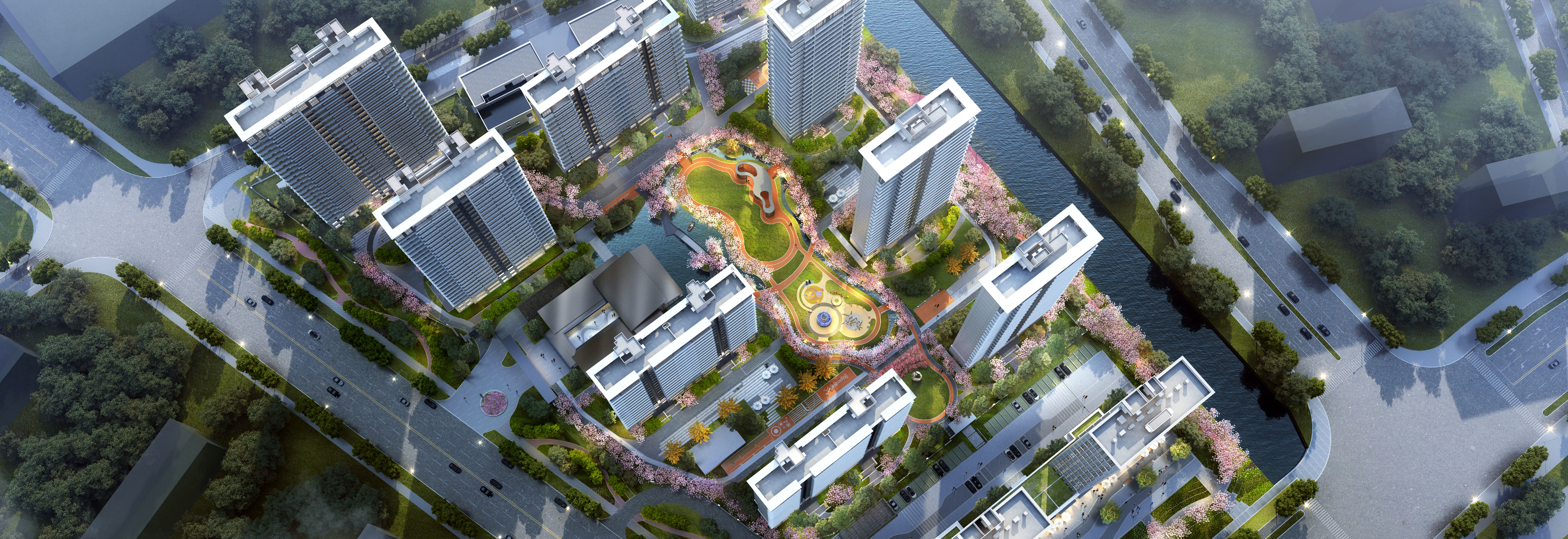 “夕阳归路远又长,西郊向晚亦苍茫。篦梁灯火流星处,正是文亨好时光”, 旧时常州城,“西郊八景”闻名遐迩,有着一派繁华的江南景象。然而数百年沧海桑田,城市变迁,一些景致已不复存在,本项目景观设计从中国和日本古典园林文化的背景出发,借鉴传统造园手法,以现代园林形式表现,将当年西郊八景中的诗意江南多思路多手法缩摹在“龙洲琅越”项目之中,营造自然、诗意、简单、本真的景观。设计以自然式景观空间为骨骼框架,以水为脉,辅以栈道、廊架、平台,构建整体景观格局。将传统文化元素与景观建立深刻联系,于设计细节中体现,提升场地文化氛围,展现当年西郊八景中的诗意江南。