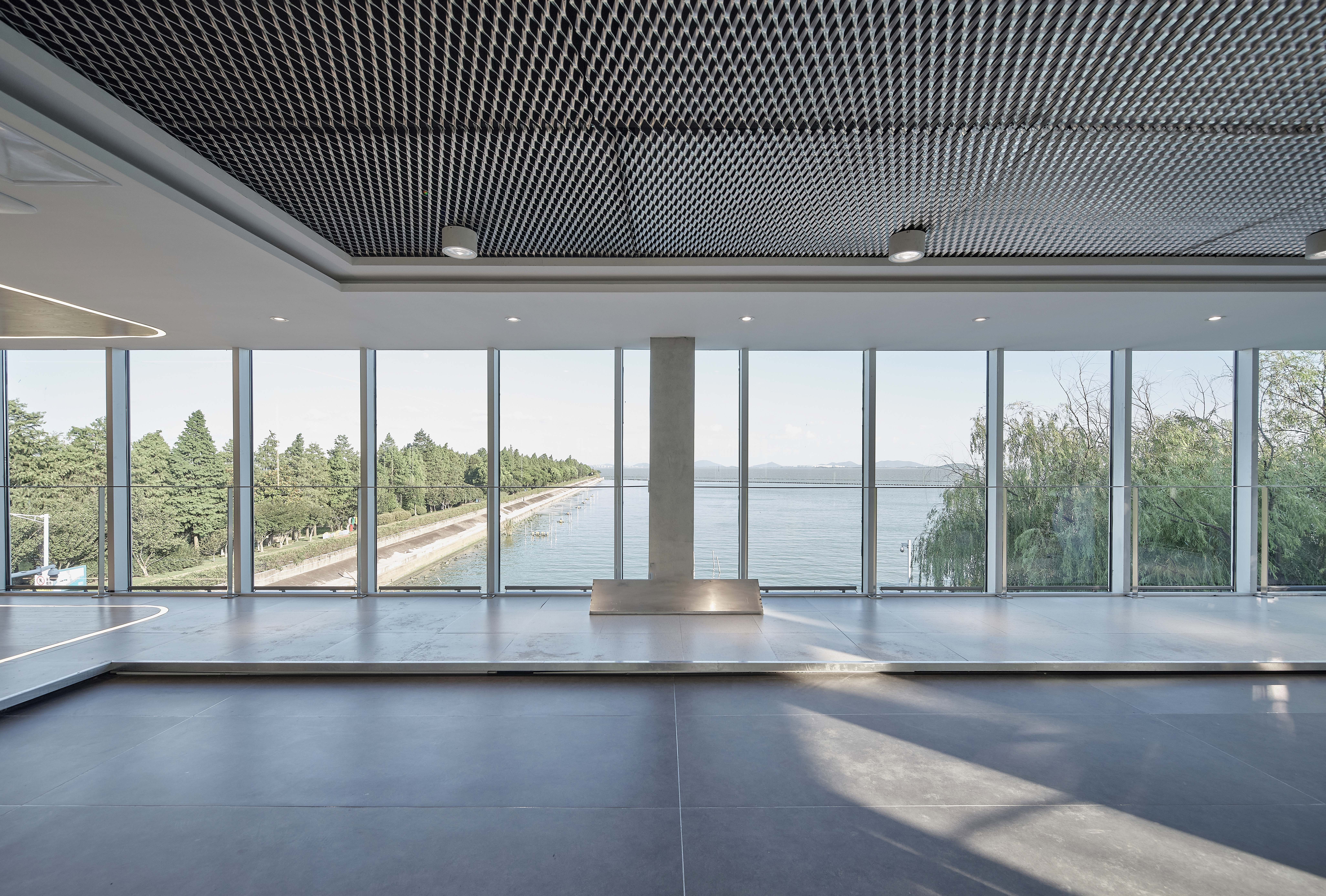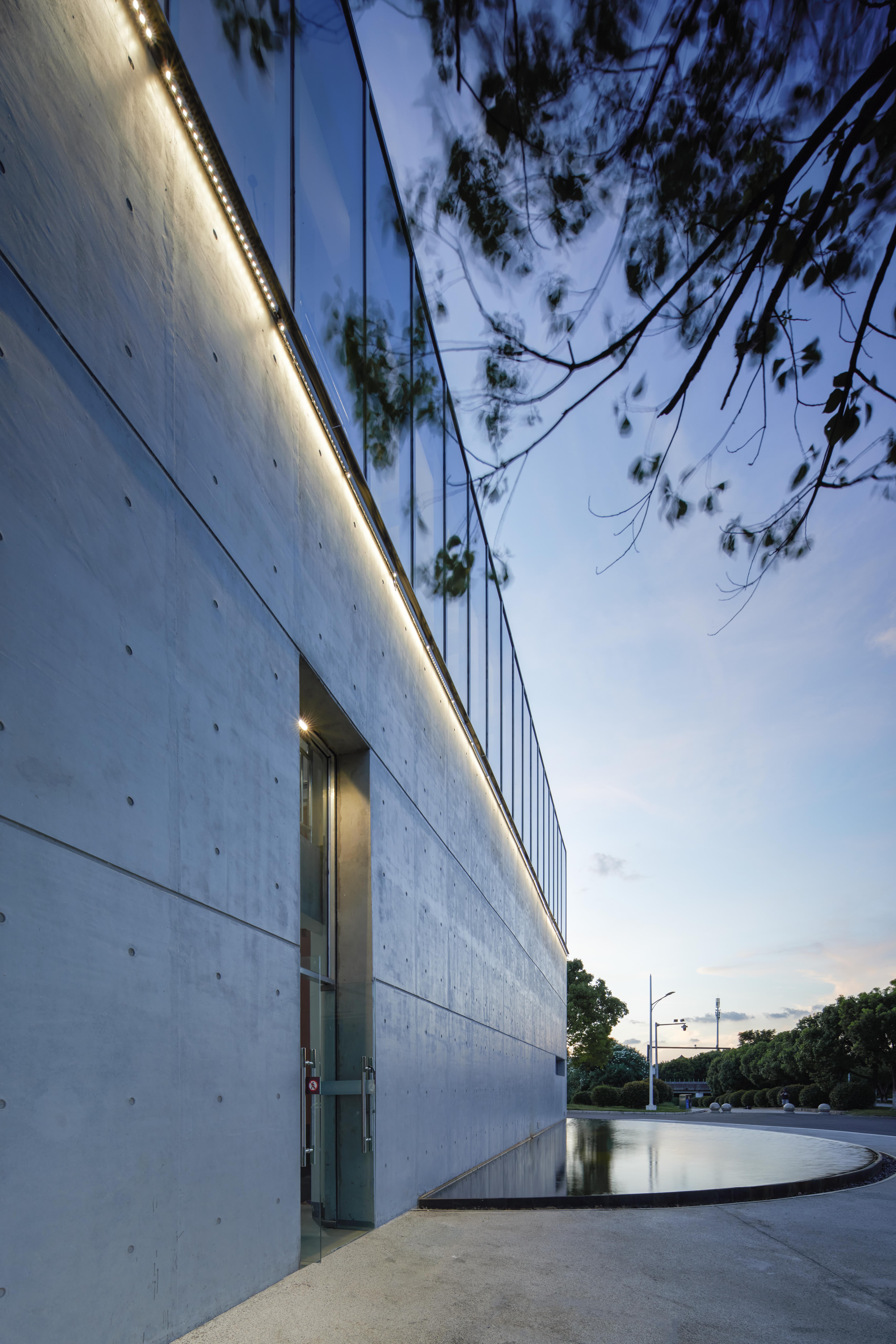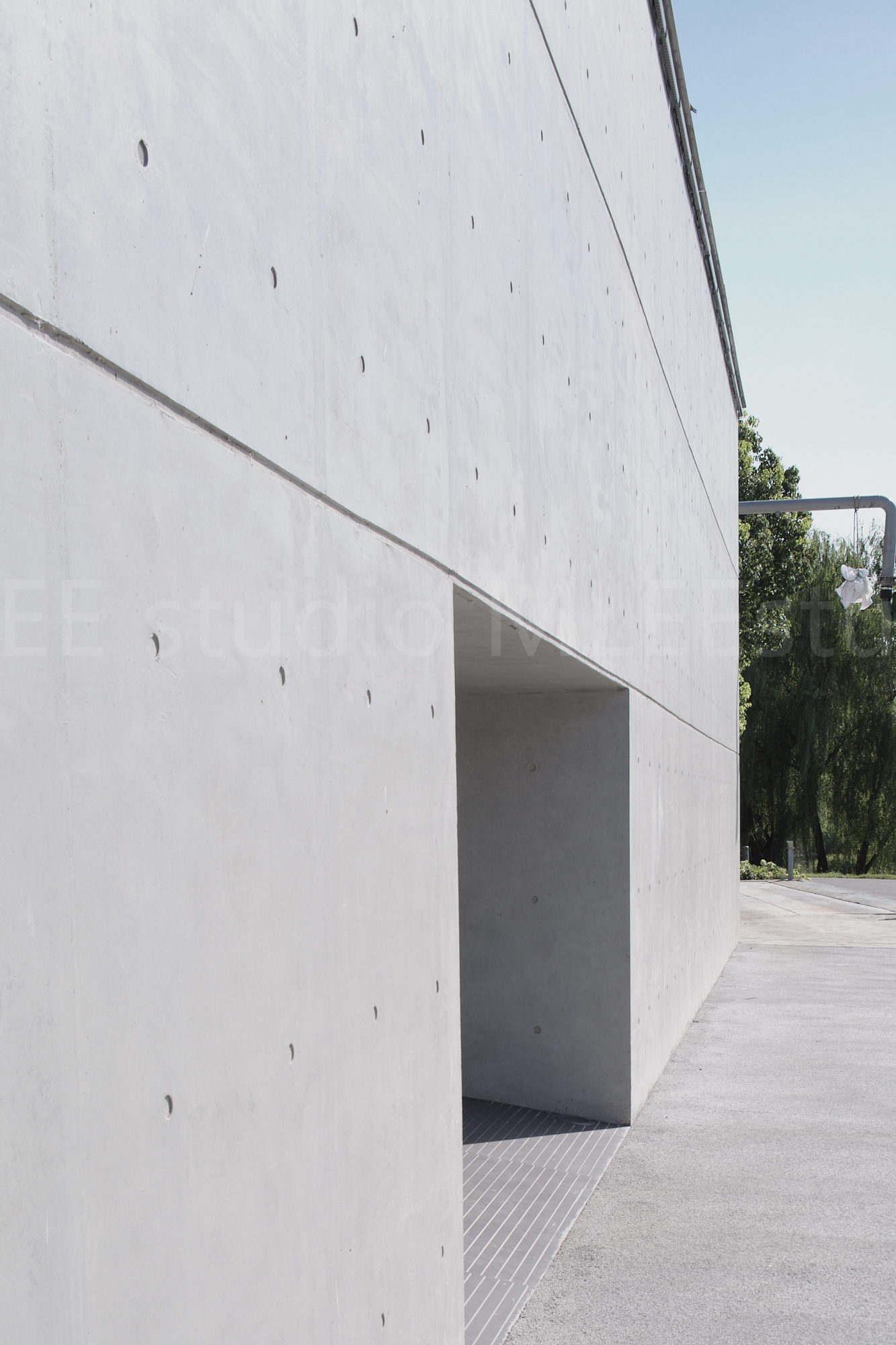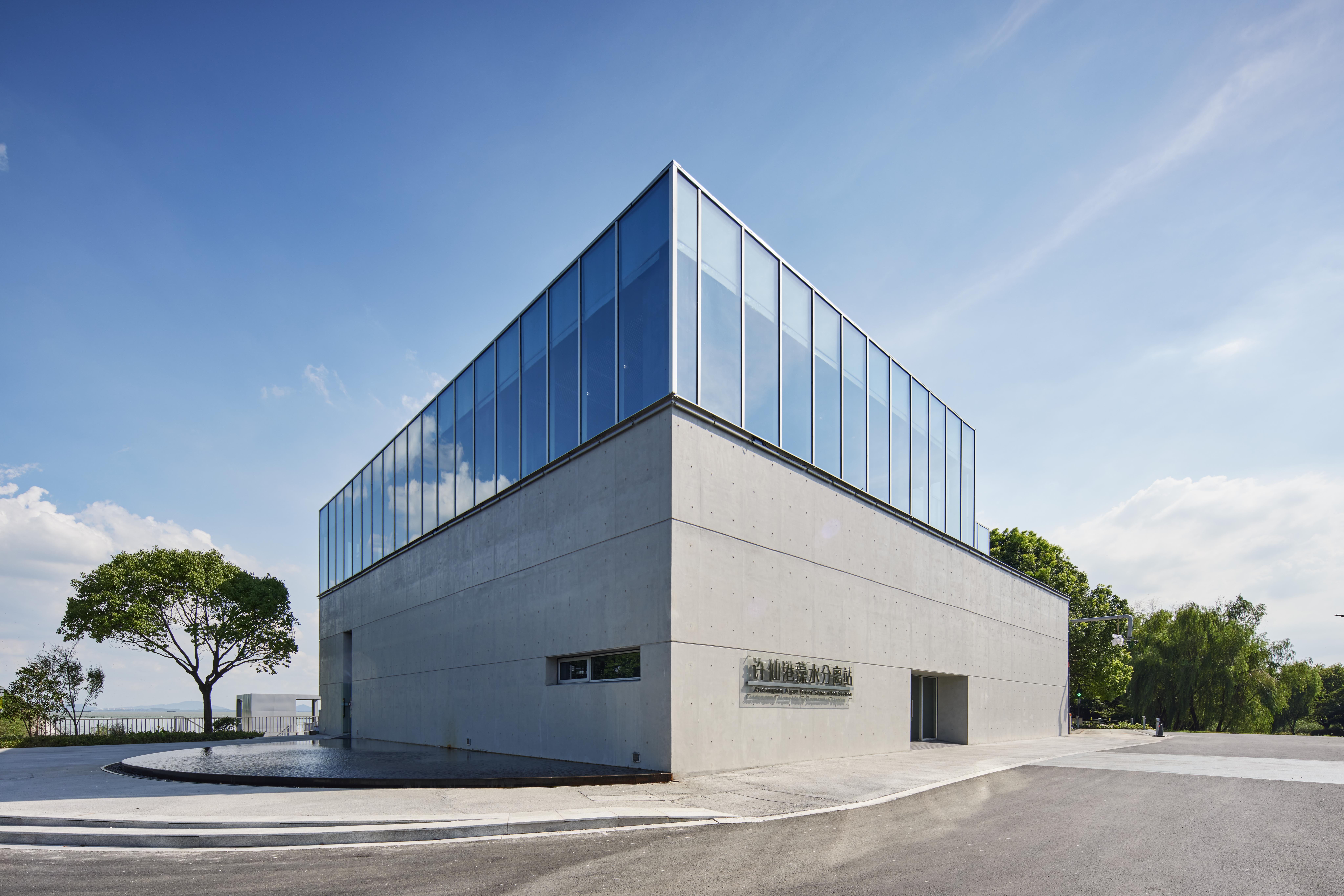 位处湿地公园、太湖之畔,建筑最好的表达应是谦逊低调的姿态,因此分离站的外观及形式都采用最干净简洁的语言。建筑外立面由清水混凝土和玻璃幕墙上下两段构成,展现建筑形体和材料本真的美感。玻璃幕墙将梁柱结构包裹在内,玻璃与清水混凝土模板宽度对应,使得建筑整体呈现严谨、纯粹、简洁的现代之美。半圆形的镜面水池环抱建筑东侧,映射朴素、干净的清水混凝土墙面。