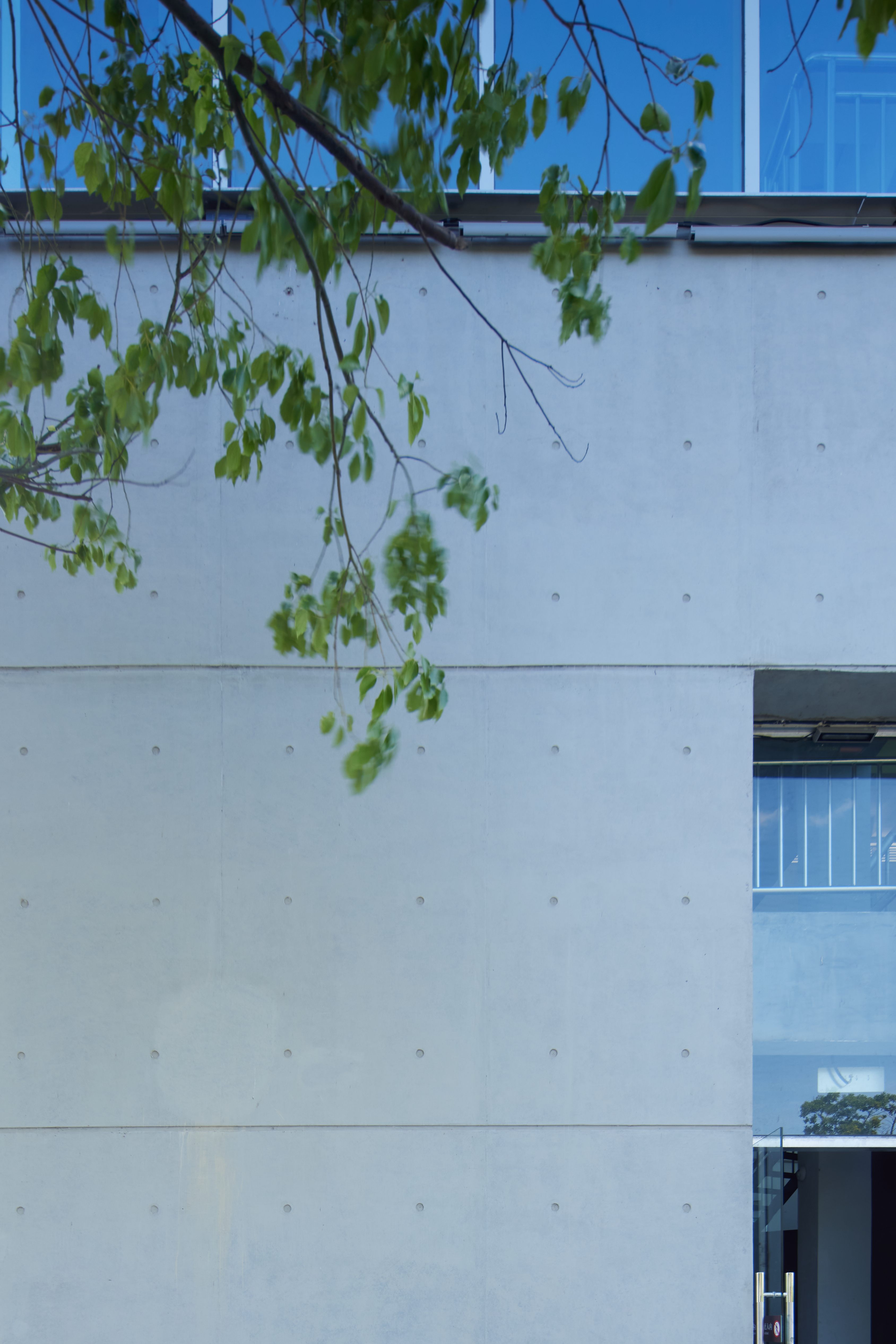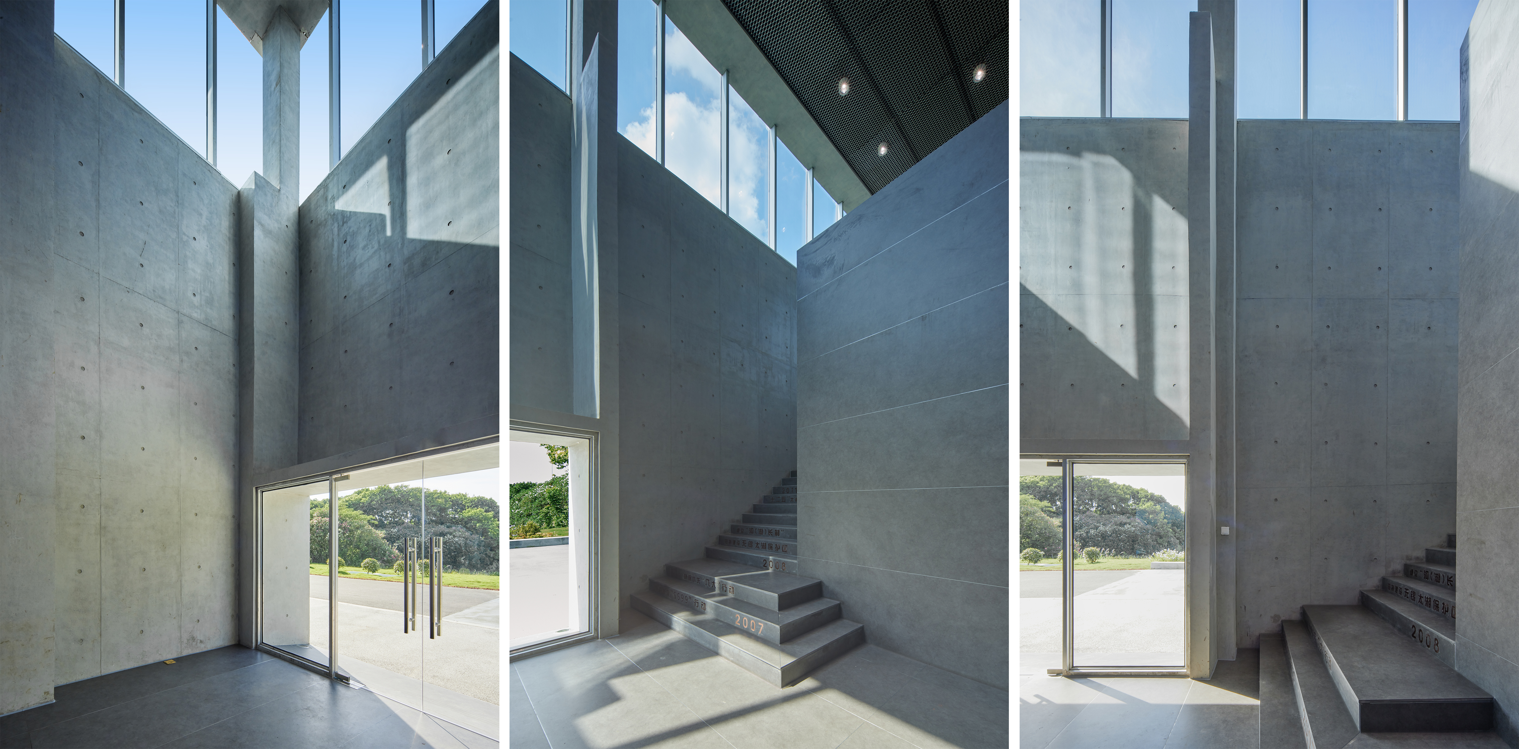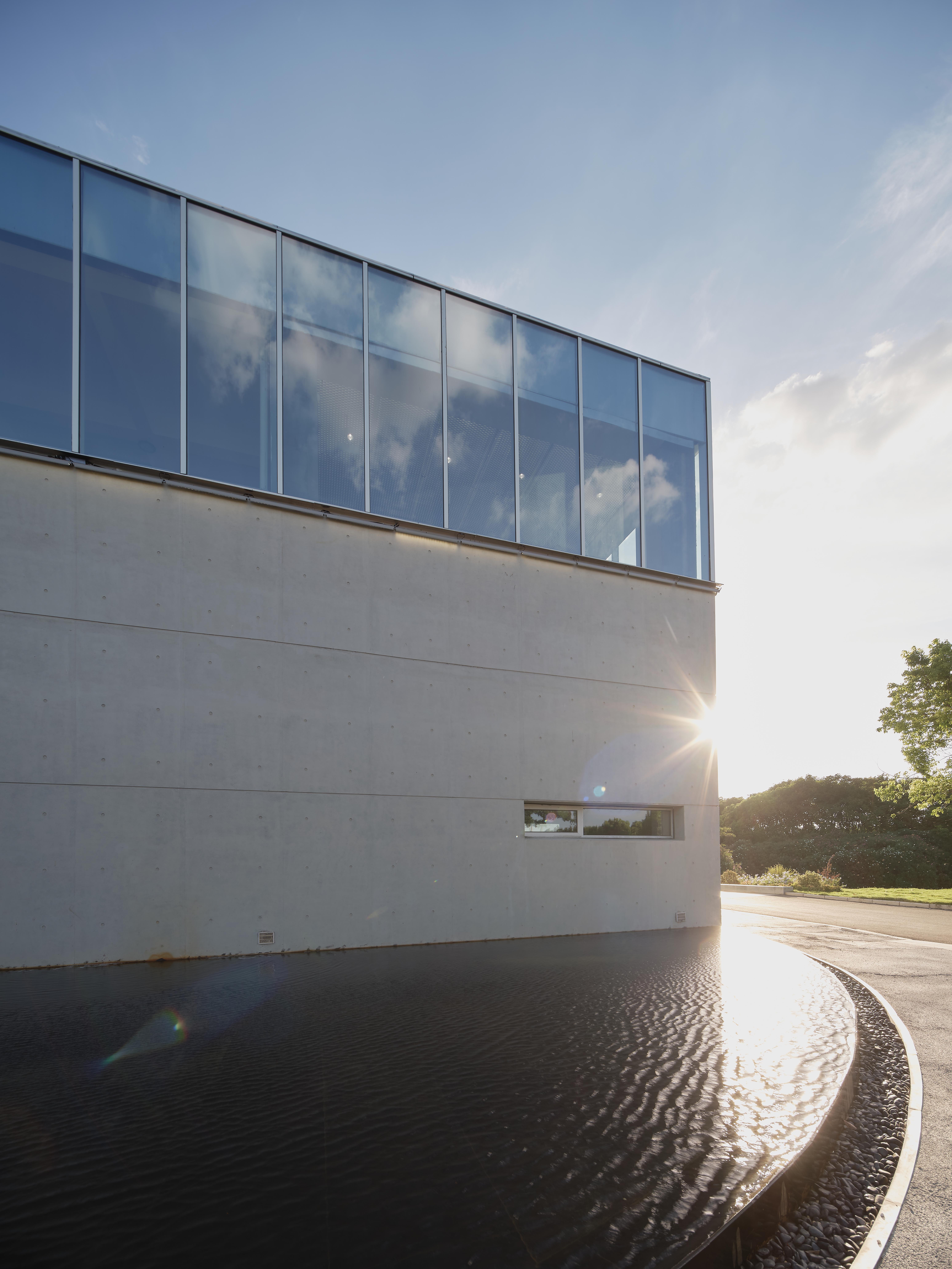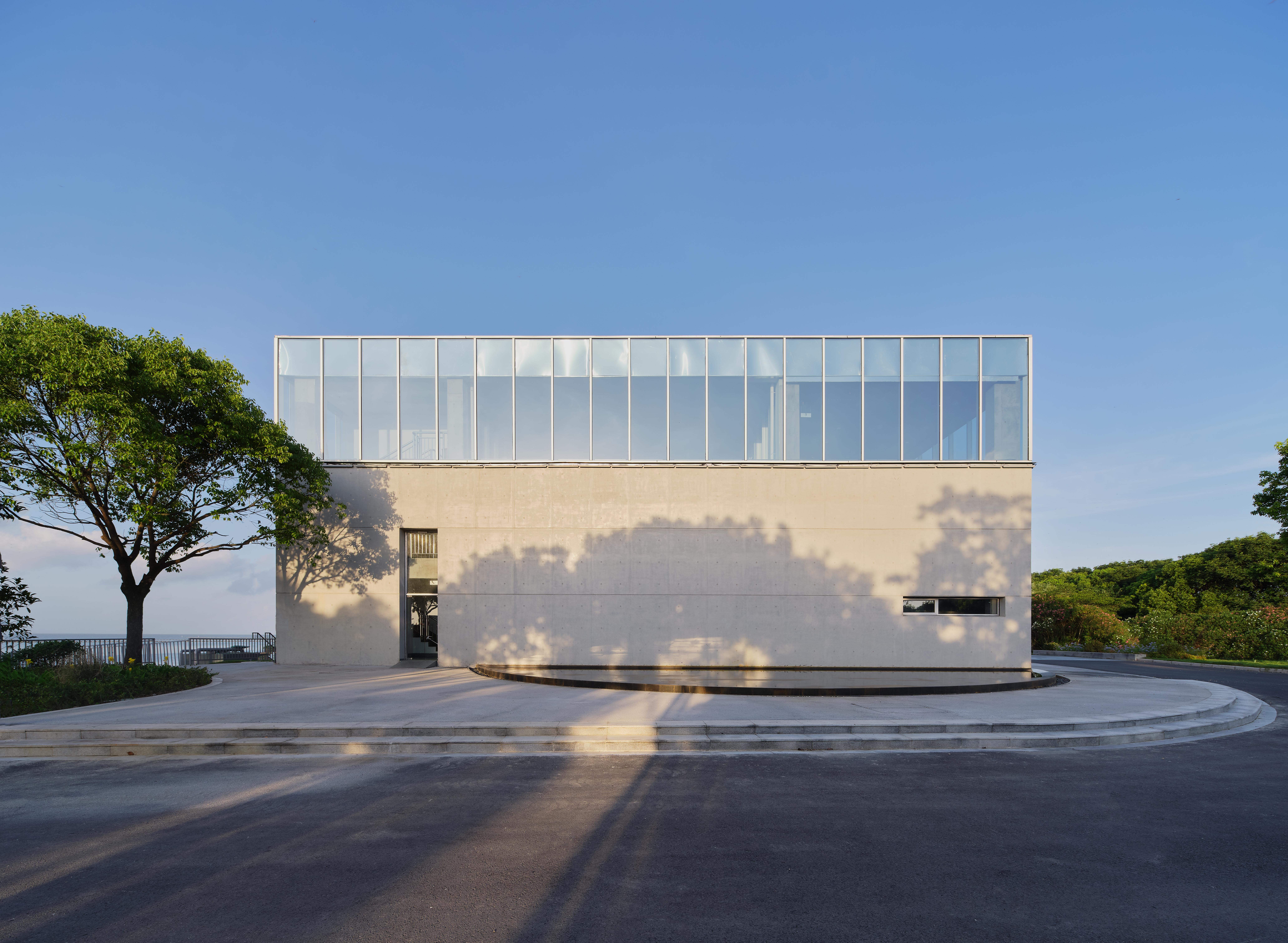 位处湿地公园、太湖之畔,建筑最好的表达应是谦逊低调的姿态,因此分离站的外观及形式都采用最干净简洁的语言。建筑外立面由清水混凝土和玻璃幕墙上下两段构成,展现建筑形体和材料本真的美感。玻璃幕墙将梁柱结构包裹在内,玻璃与清水混凝土模板宽度对应,使得建筑整体呈现严谨、纯粹、简洁的现代之美。半圆形的镜面水池环抱建筑东侧,映射朴素、干净的清水混凝土墙面。