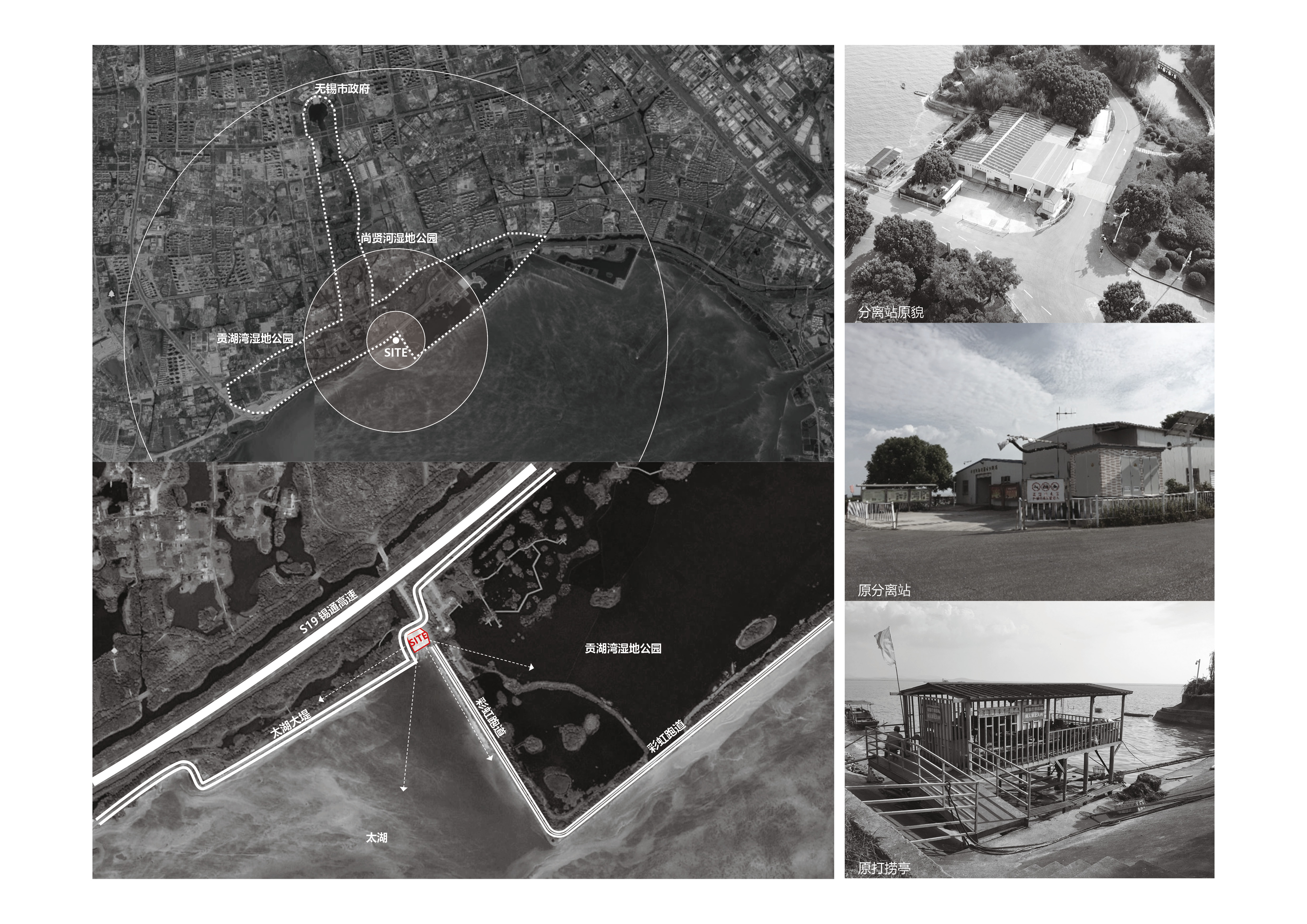 许仙港藻水分离站位于无锡市南端,美丽的贡湖湾湿地公园内,坐落于太湖之滨。而无锡夏日频繁爆发的蓝藻和盛行的东南风向,使基地周边成为太湖蓝藻的“重灾区”和“主战场”,2007年以来,无锡市政府始终坚定“除藻治太”行动,大力推进太湖流域生态共治。而场地中原分离站陈旧的设施无法满足日益增多的蓝藻治理需求,软硬件设施更新迫在眉睫。