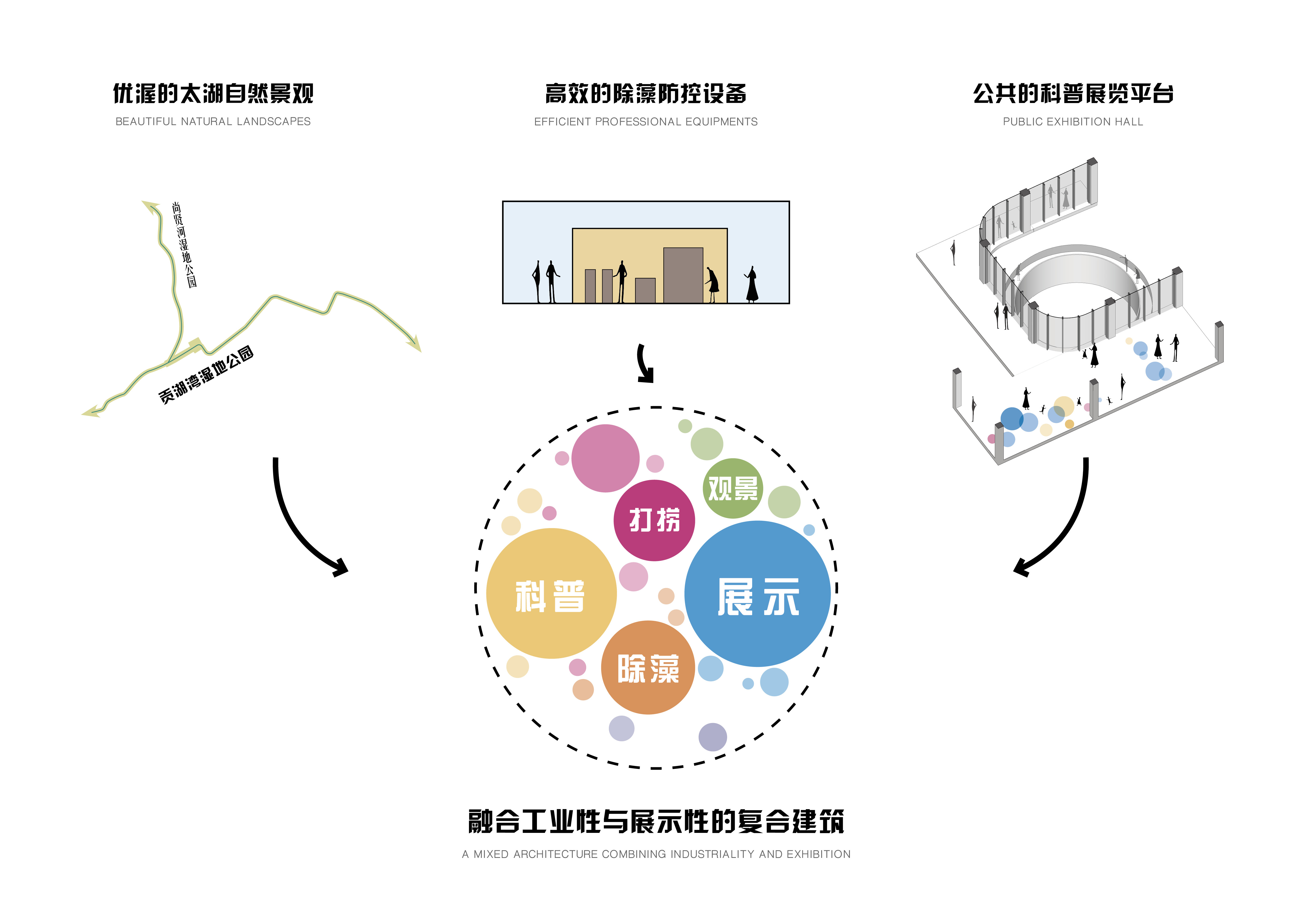 本项目不仅作为蓝藻打捞、分离的站点之一,亦作为蓝藻防控工作的宣传和展示窗口,通过集约的空间规划、创新的展示模式、现代的建筑造型,打造一个空间积极、开放体验、功能复合的蓝藻治理站点。