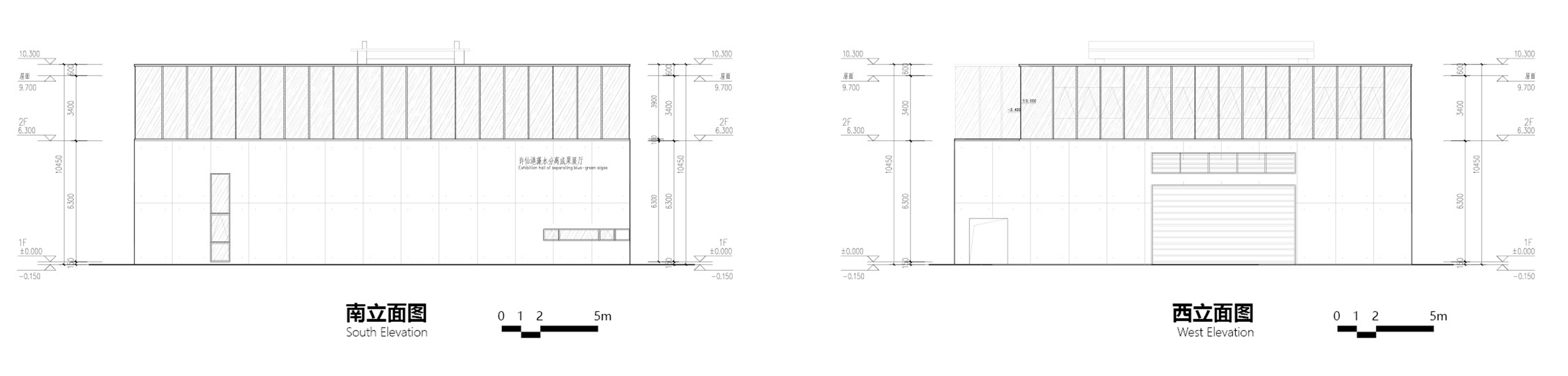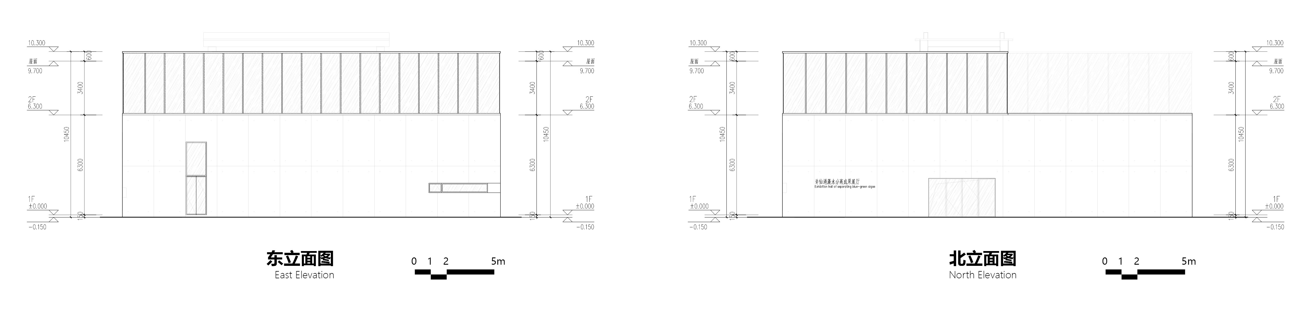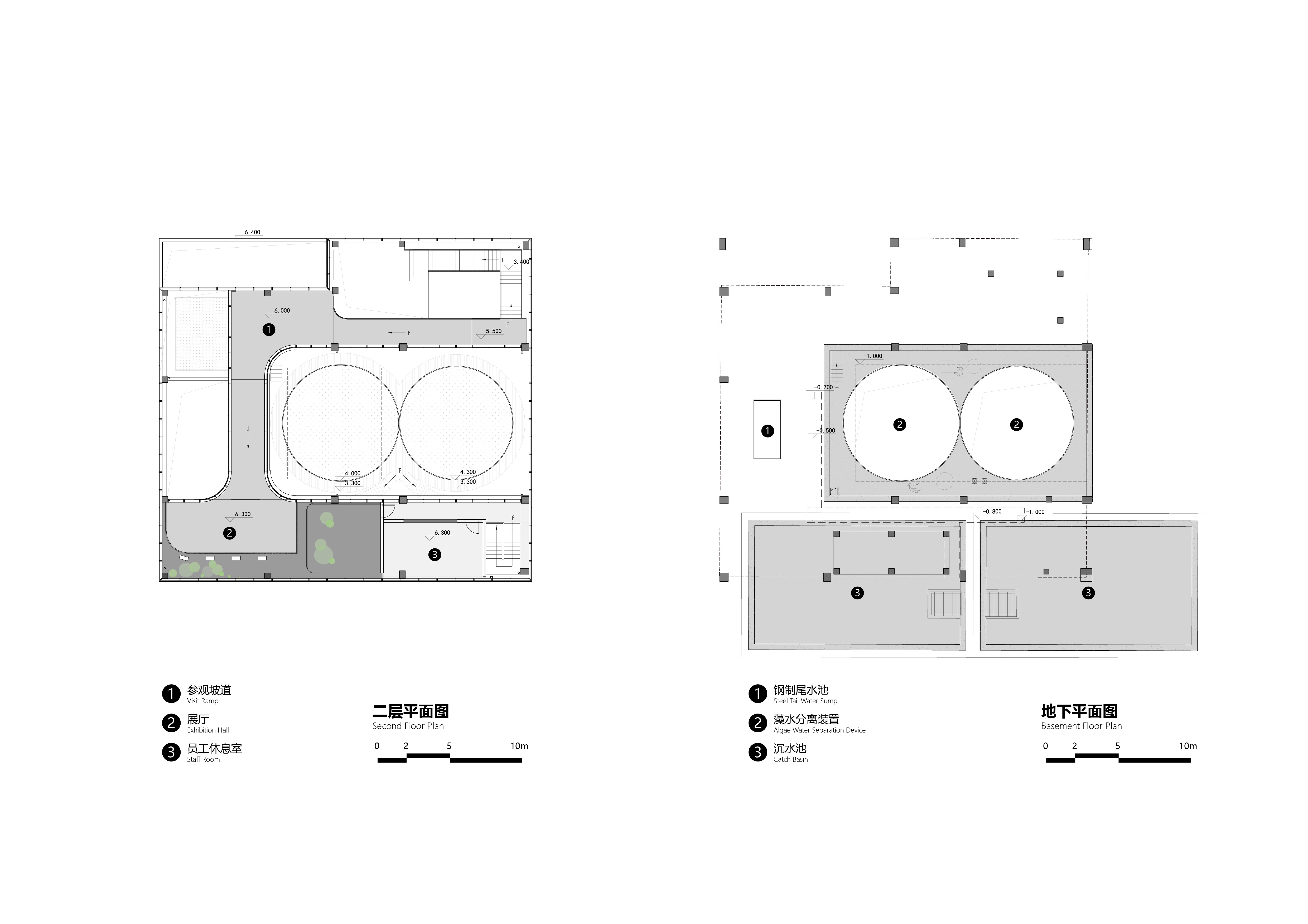 打捞作业与参观展示融为一体是本案设计的主要策略。在空间组织上,一层主要为除藻作业区,根据工业流程,高效有序地排布打捞设备;二层围绕作业区形成完整流畅的展示参观空间。通过平面功能与竖向交通的叠加组织,将公共、复合的理念呈现出来。