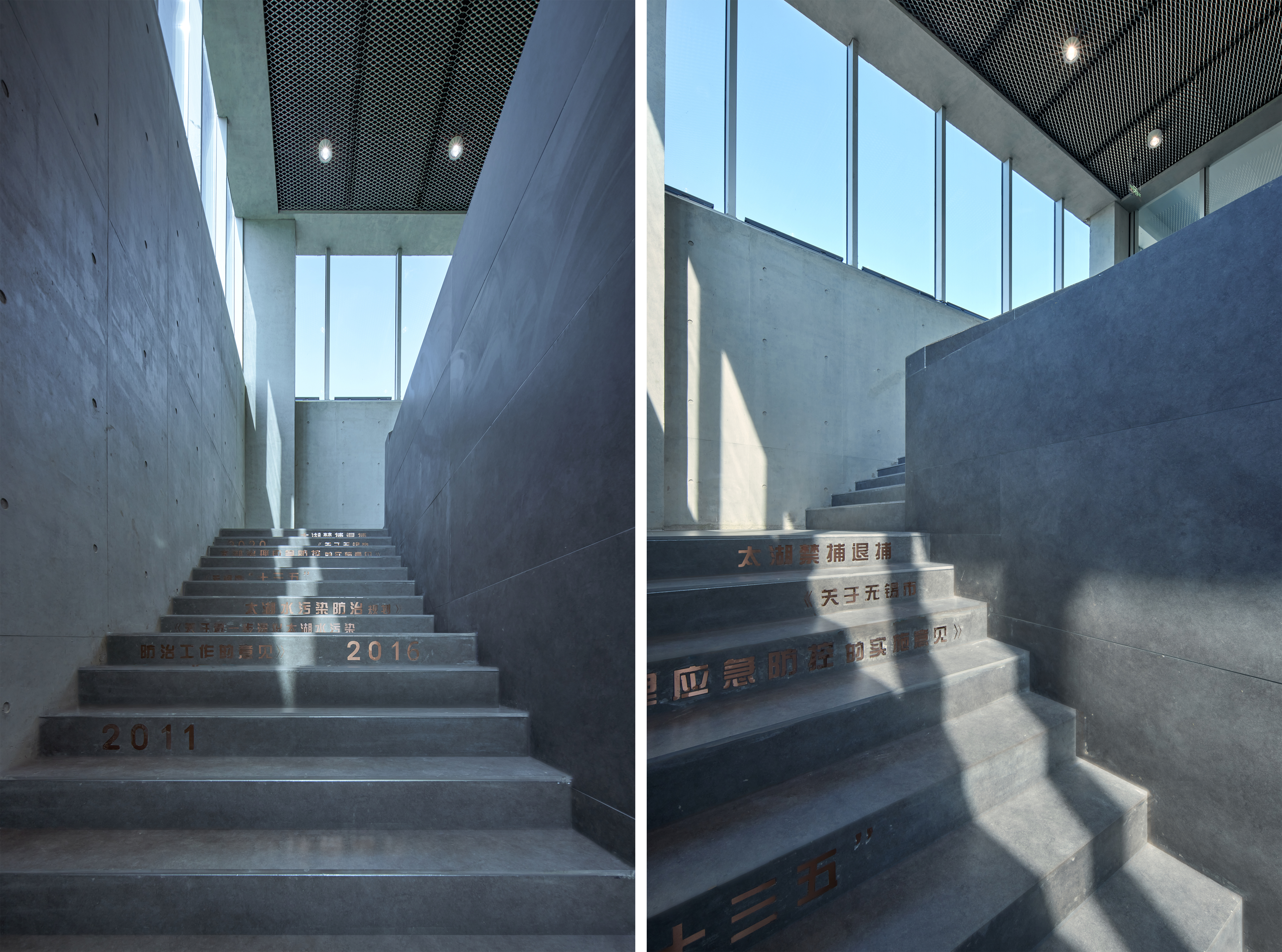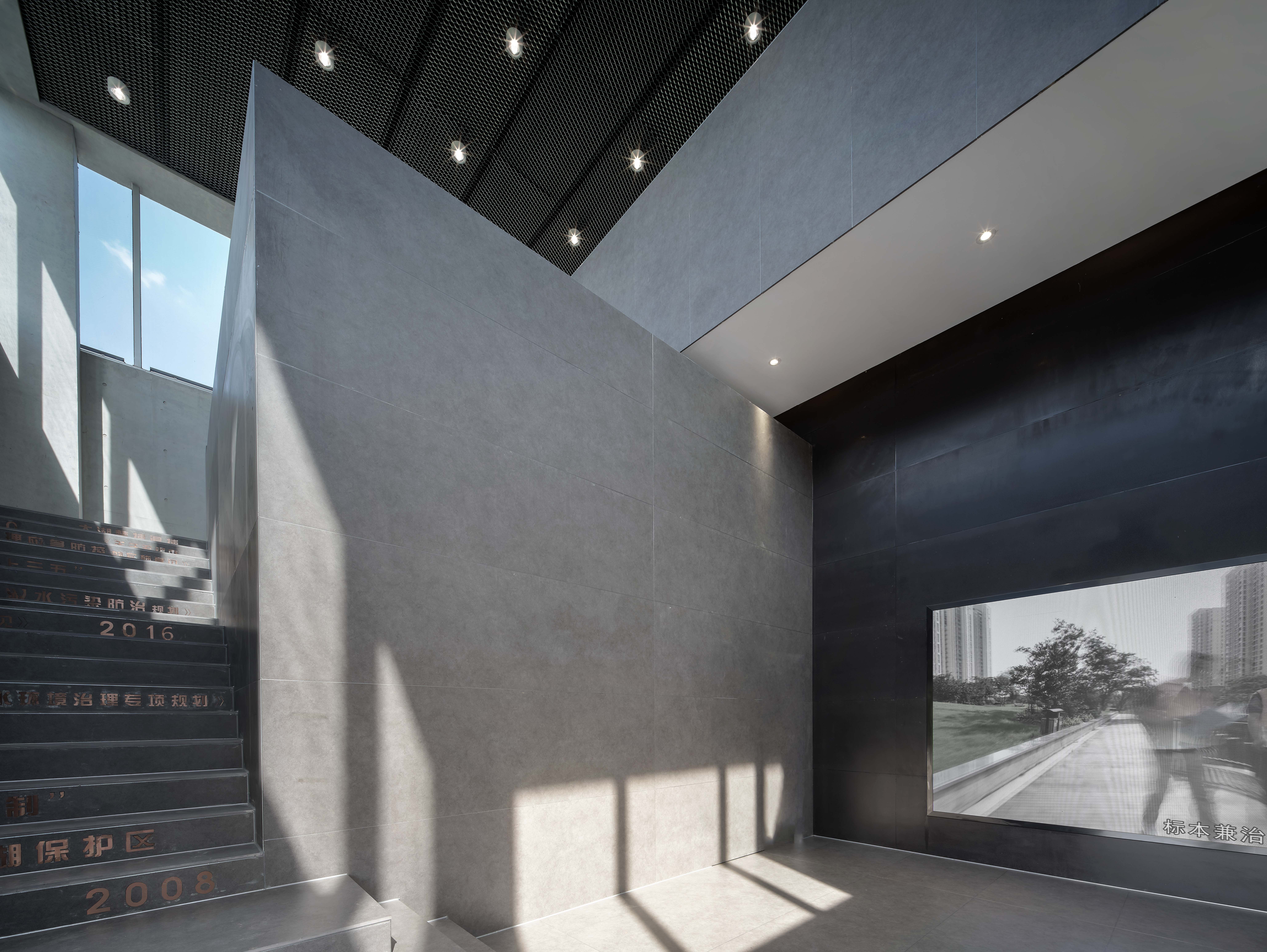 深灰色岩板石地面通过楼梯延伸至二层展厅,强化了空间的整体性和引导性。并以铜板刻字的方式,将无锡“除藻治太”的手段与决心印刻在楼梯踏步。