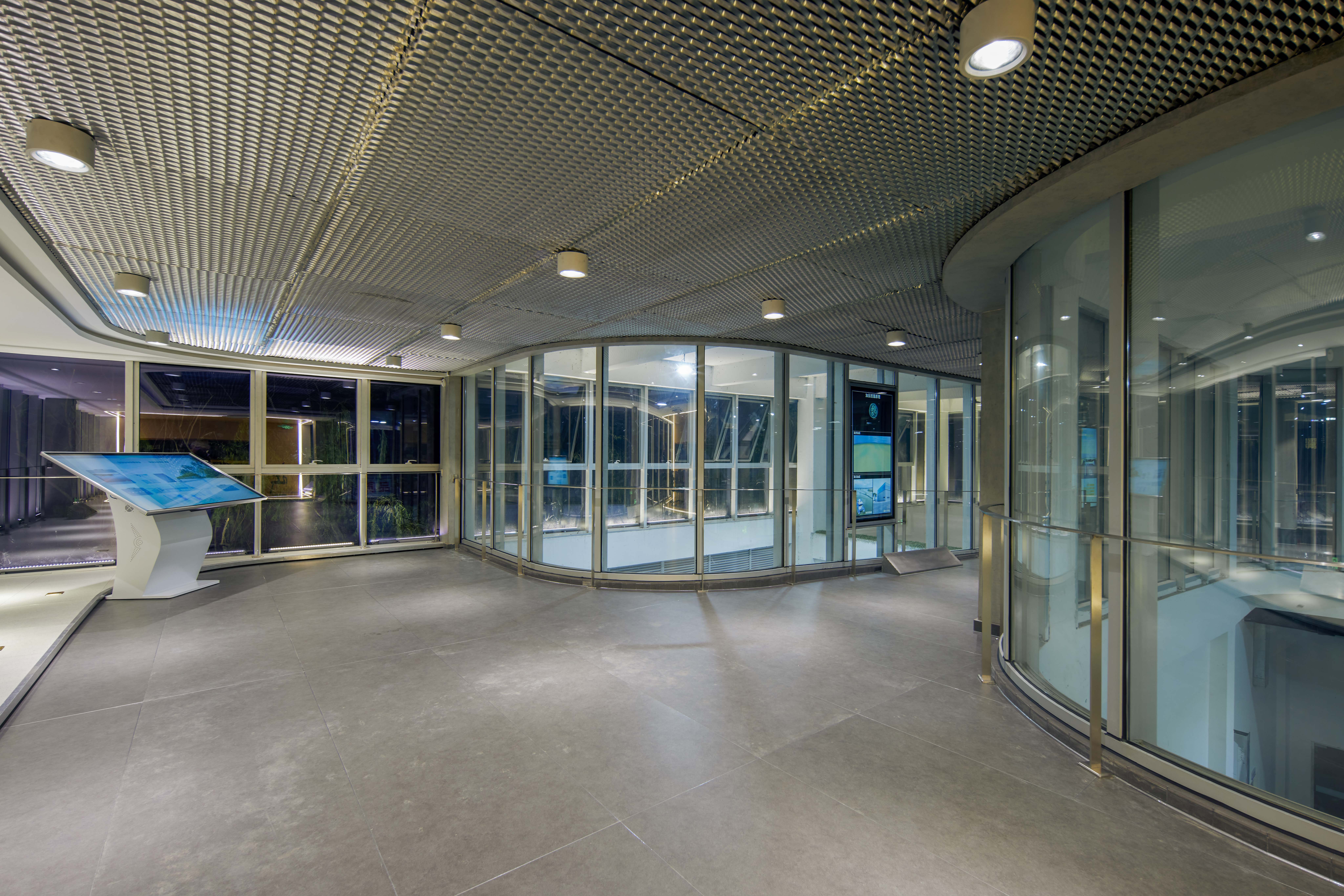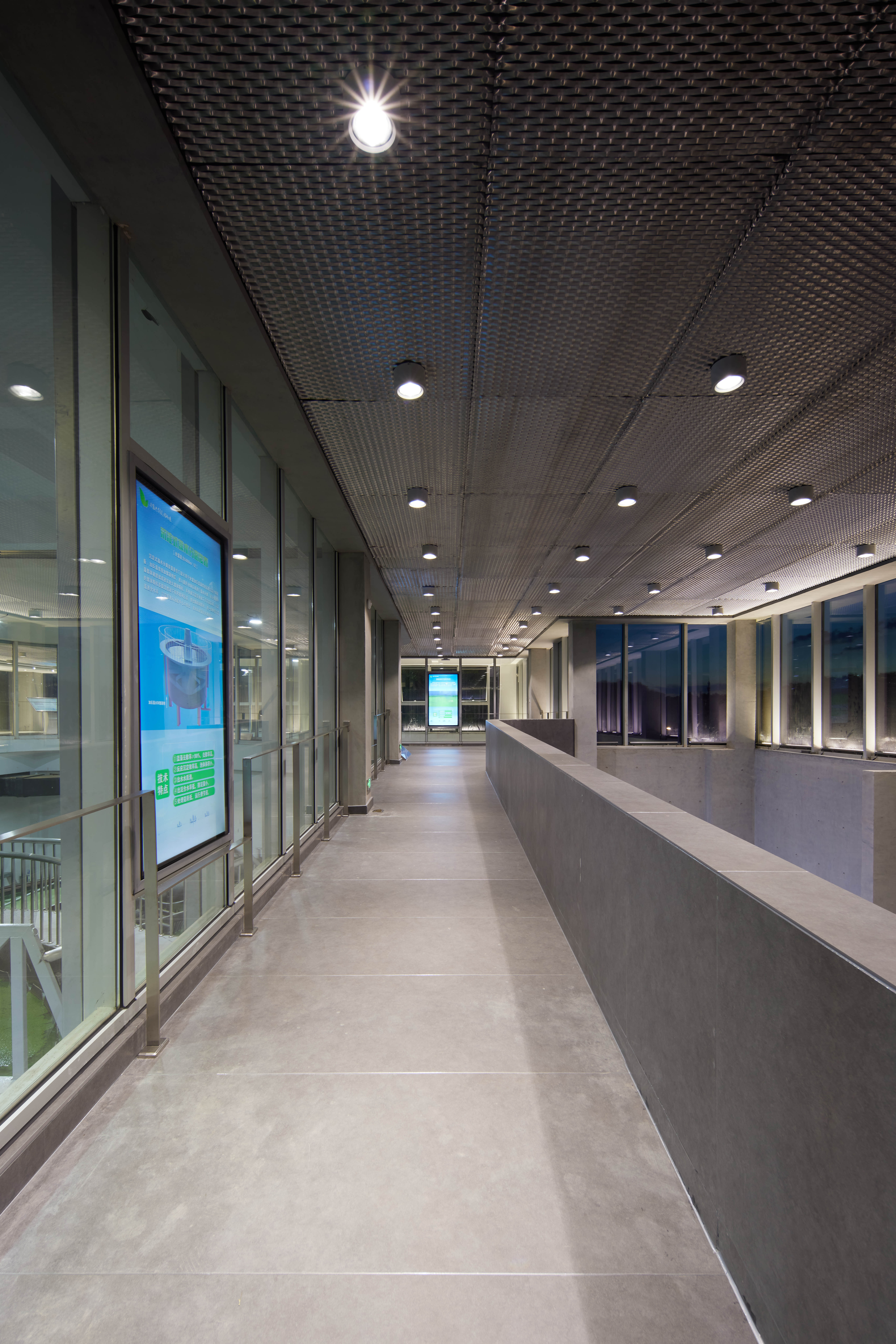 环绕设备的二层展厅采用通透的落地玻璃窗,并将各个步骤的除藻工艺流程印刻在冰屏上,沿着楼梯和坡道进入二层,可观看到藻水分离的操作过程及其图文解说。