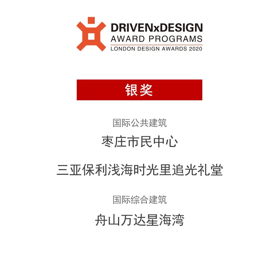 联创设计集团三项作品斩获2021伦敦设计大奖三项奖项。枣庄市民中心荣获“国际公共建筑银奖”,三亚保利浅海时光里追光礼堂荣获“国际公共建筑银奖”,舟山万达星海湾荣获“国际综合建筑银奖”。