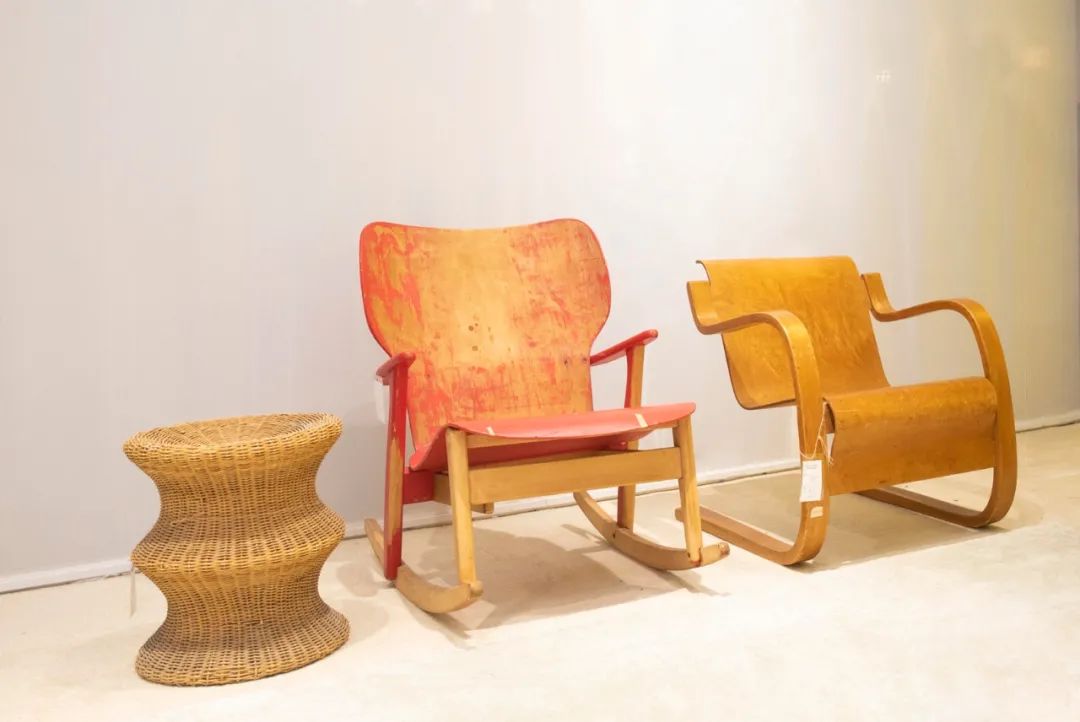 从左至右:Juttu jakkara蘑菇双凳 阿尼奥 1961年、Domus Lux lounge chair 塔佩瓦拉 1948年、42 birch armchair 42桦木扶手椅 阿尔瓦·阿尔托 1932年