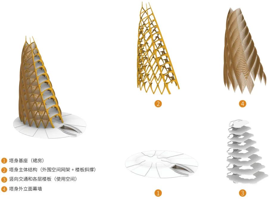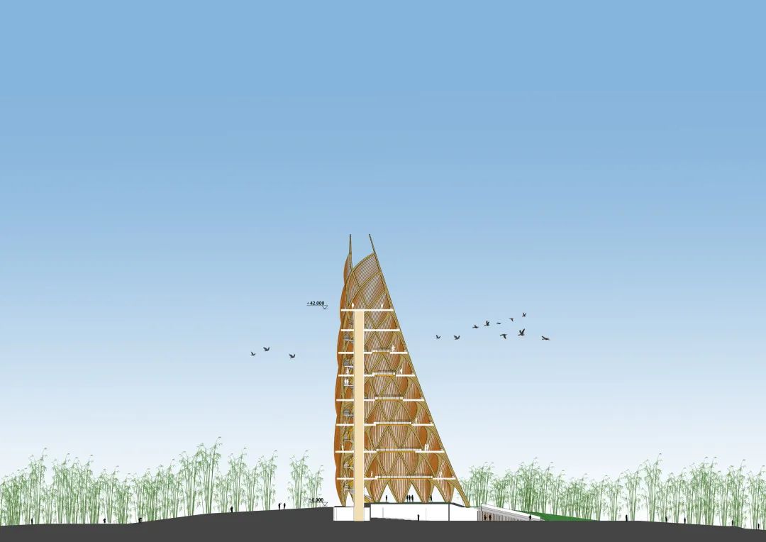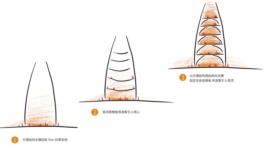 “剖开的笋”这一处理手法,是有意让塔体每一层都有一个完全开敞的景观面朝向基地核心区。这样也能使得塔身不对称,身为整个基地的制高点,方便游客以之为参照物,判断方位。